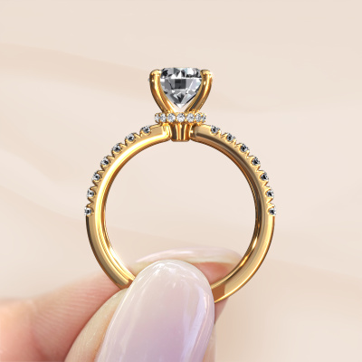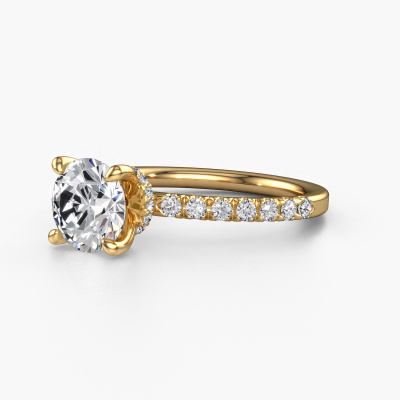 The ring shown above is called the Crystal rnd 4. We call this type of ring a pavé solitaire ring because it has one centre gemstone and a band that is also pave set with gemstones. The 14 Carat gold engagement ring is set with a round 1.50 crt lab grown diamond centre stone and the band is pave set with lab grown diamond gemstones. Each jewel is made to shine bright around your finger. Each jewel is hand made with love by our goldsmiths.This fantasy gold pavé solitaire engagement ring has an exquisite round lab grown diamond centre stone. To further accentuate the centre stone, the band is fully set with more lab-grown diamonds. Its open prong setting allows light to strike the lab grown diamond from various angles and this adds sparkle to your lab grown diamond ring. The photo shown above depicts the goldsmith's carefully handcrafted details of the ring. The high positioning of the centre stone is truly eye-catching. The perfect engagement ring for the crown jewel of your life! By using our modern techniques, we can design and customize the finest quality jewels with the utmost care for you. Our engagement rings are always priced 30 percent lower than other jewellers. We make engagement rings to order so we don't have to maintain a large stock. If you have a certain budget, we are more than happy to advice you accordingly.Have you found a specific engagement ring somewhere which you would like to give to your loved one? Please feel free to express your wishes to our jewel designers because we would be honoured to turn your design into a fantasy engagement ring. You can follow the development of your ring design because we use 3D drawings. This gives you a realistic preview of how your design will look. You can also preorder a dummy. A dummy is a plastic ring, which can be shaped according your ring design. You can try it on and check if its width and size are suitable for you. We will gladly send you a non-binding offer, based on a fair price/ quality ratio. It will amaze you, considering the quality of the ring and gemstones.To make it easier for you, we offer a 30 day return policy. Check our terms and conditions.