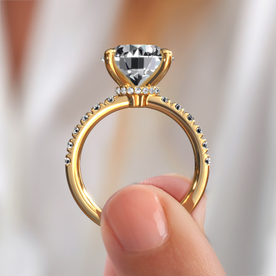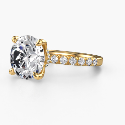 The ring shown above is called the Crystal rnd 4. We call this type of ring a pavé solitaire ring because it has one centre gemstone and a band that is also pave set with gemstones. The 14 Carat gold engagement ring is set with a round 5.00 crt lab grown diamond centre stone and the band is pave set with lab grown diamond gemstones. Each jewel is made to shine bright around your finger. Each jewel is hand made with love by our goldsmiths.This fantasy gold pavé solitaire engagement ring has an exquisite round lab grown diamond centre stone. To further accentuate the centre stone, the band is fully set with more lab-grown diamonds. Its open prong setting allows light to strike the lab grown diamond from various angles and this adds sparkle to your lab grown diamond ring. The photo shown above depicts the goldsmith's carefully handcrafted details of the ring. The high positioning of the centre stone is truly eye-catching. The perfect engagement ring for the crown jewel of your life! By using our modern techniques, we can design and customize the finest quality jewels with the utmost care for you. Our engagement rings are always priced 30 percent lower than other jewellers. We make engagement rings to order so we don't have to maintain a large stock. If you have a certain budget, we are more than happy to advice you accordingly.Have you found a specific engagement ring somewhere which you would like to give to your loved one? Please feel free to express your wishes to our jewel designers because we would be honoured to turn your design into a fantasy engagement ring. You can follow the development of your ring design because we use 3D drawings. This gives you a realistic preview of how your design will look. You can also preorder a dummy. A dummy is a plastic ring, which can be shaped according your ring design. You can try it on and check if its width and size are suitable for you. We will gladly send you a non-binding offer, based on a fair price/ quality ratio. It will amaze you, considering the quality of the ring and gemstones.To make it easier for you, we offer a 30 day return policy. Check our terms and conditions.