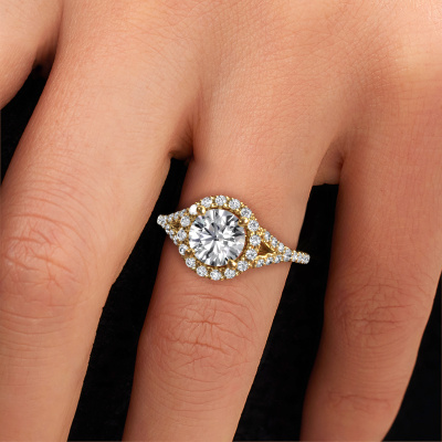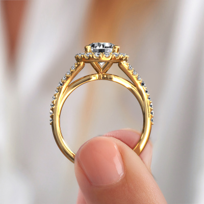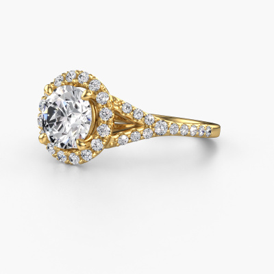 The ring shown above is called the Kimber RND. We call this type of ring a pavé solitaire ring because it has one centre gemstone and a band that is also pave set with gemstones. The 14 Carat gold engagement ring is set with a round 1.50 crt lab grown diamond centre stone and the band is pave set with lab grown diamond gemstones. Each jewel is created to add sparkle to your finger, each jewel is lovingly made by hand by our goldsmiths.This classic gold pavé solitaire engagement ring has an exquisite round lab grown diamond centre stone. To further accentuate the centre stone, the band is fully set with more lab-grown diamonds. Its open prong setting allows light to strike the lab grown diamond from various angles and this adds sparkle to your lab grown diamond ring. The photo shown above depicts the goldsmith's carefully handcrafted details of the ring. The high positioning of the centre stone is truly eye-catching. The perfect engagement ring for the crown jewel of your life! After receiving your order, our goldsmiths will passionately start the creative process of making your engagement ring in our own studio. Because we don't have a big stockpile, these costs will not be passed on to you. Our pricing is proof of that! We offer top quality jewels at lowest price, guaranteed.Our team adds new designs to our online collection daily. Our designers and goldsmiths work together in creating the best design. We strive to offer a diverse collection of jewels. Perhaps you have a specific jewel design in mind. One you came across somewhere. Please contact us for a free consultation. We will make you an offer, based on a fair price/ quality ratio, that will baffle you.To make it easier for you, we offer a 30 day return policy. Check our terms and conditions.