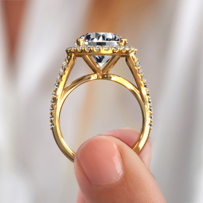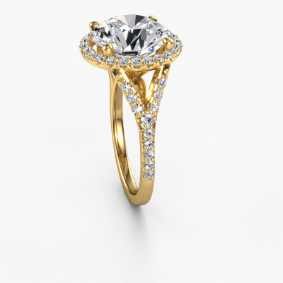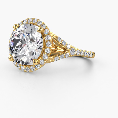 The ring shown above is called the Kimber RND. We call this type of ring a pavé solitaire ring because it has one centre gemstone and a band that is also pave set with gemstones. The 14 Carat gold engagement ring is set with a round 5.00 crt lab grown diamond centre stone and the band is pave set with lab grown diamond gemstones. Each jewel is created to add sparkle to your finger, each jewel is lovingly made by hand by our goldsmiths.This classic gold pavé solitaire engagement ring has an exquisite round lab grown diamond centre stone. To further accentuate the centre stone, the band is fully set with more lab-grown diamonds. Its open prong setting allows light to strike the lab grown diamond from various angles and this adds sparkle to your lab grown diamond ring. The photo shown above depicts the goldsmith's carefully handcrafted details of the ring. The high positioning of the centre stone is truly eye-catching. The perfect engagement ring for the crown jewel of your life! After receiving your order, our goldsmiths will passionately start the creative process of making your engagement ring in our own studio. Because we don't have a big stockpile, these costs will not be passed on to you. Our pricing is proof of that! We offer top quality jewels at lowest price, guaranteed.Our team adds new designs to our online collection daily. Our designers and goldsmiths work together in creating the best design. We strive to offer a diverse collection of jewels. Perhaps you have a specific jewel design in mind. One you came across somewhere. Please contact us for a free consultation. We will make you an offer, based on a fair price/ quality ratio, that will baffle you.To make it easier for you, we offer a 30 day return policy. Check our terms and conditions.