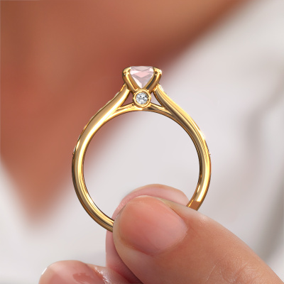 The ring shown above is called the Valorie cus 2. We call this type of ring a pavé solitaire ring because it has one centre gemstone and a band that is also pave set with gemstones. The 14 Carat gold engagement ring is set with a cushion 5.5 mm morganite champagne centre stone and the band is pave set with diamond gemstones. Each jewel is made just for you by our master goldsmiths in our own studio.This traditional gold pavé solitaire engagement ring has an exquisite cushion morganite champagne centre stone. To further accentuate the centre stone, the band is fully set with more diamonds. Its open prong setting allows light to strike the morganite champagne from various angles and this adds sparkle to your morganite champagne ring. The photo shown above depicts the goldsmith's carefully handcrafted details of the ring. The high positioning of the centre stone is truly eye-catching. The perfect engagement ring for the crown jewel of your life! By using a combination of the latest modern techniques, combined with ancient crafting, we can make all our engagement rings in our own studio. Each jewel is made to order. This is advantageous because we can offer you a price you won't find anywhere else.Our designers and goldsmiths work together each day, creating new jewels. Perhaps you have found a nice traditional engagement ring somewhere, which can be used to customize your unique ring. Please feel free to contact us. We will make you an offer, based on a fair price/ quality ratio, which will amaze you.To make it easier for you, we offer a 30 day return policy. Check our terms and conditions.