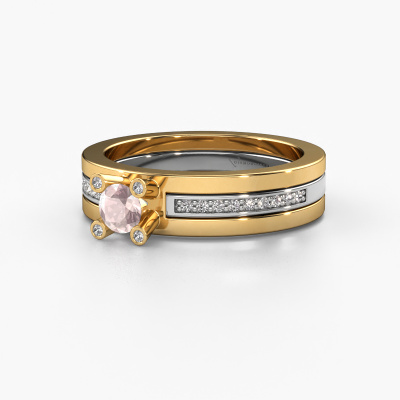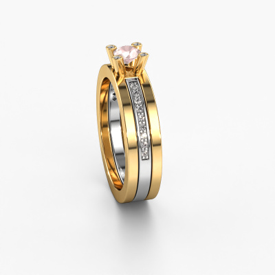 The ring shown above is called the Alisha. We call this type of ring a pavé solitaire ring because it has one centre gemstone and a band that is also pave set with gemstones. The 14 Carat gold engagement ring is set with a round 4 mm morganite champagne centre stone and the band is pave set with diamond gemstones. Each jewel is unique in every way! Simply customize to your liking,This design gold pavé solitaire engagement ring has an exquisite round morganite champagne centre stone. To further accentuate the centre stone, the band is fully set with more diamonds. Its open prong setting allows light to strike the morganite champagne from various angles and this adds sparkle to your morganite champagne ring. The photo shown above depicts the goldsmith's carefully handcrafted details of the ring. The high positioning of the centre stone is truly eye-catching. The perfect engagement ring for the crown jewel of your life! By using a combination of the latest modern techniques, combined with ancient crafting, we can make all our engagement rings in our own studio. Each jewel is made to order. This is advantageous because we can offer you a price you won't find anywhere else.Have you found a specific engagement ring somewhere which you would like to give to your loved one? Please feel free to express your wishes to our jewel designers because we would be honoured to turn your design into a design engagement ring. You can follow the development of your ring design because we use 3D drawings. This gives you a realistic preview of how your design will look. You can also preorder a dummy. A dummy is a plastic ring, which can be shaped according your ring design. You can try it on and check if its width and size are suitable for you. We will gladly send you a non-binding offer, based on a fair price/ quality ratio. It will amaze you, considering the quality of the ring and gemstones.To make it easier for you, we offer a 30 day return policy. Check our terms and conditions.