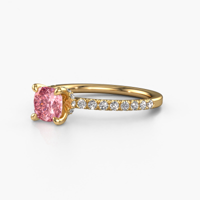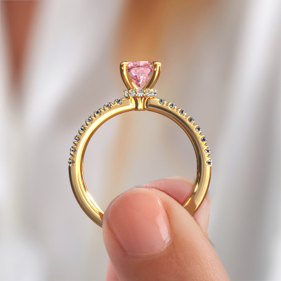 The ring shown above is called the Crystal CUS 4. We call this type of ring a pavé solitaire ring because it has one centre gemstone and a band that is also pave set with gemstones. The 14 Carat gold engagement ring is set with a cushion 5.5 mm pink lab grown diamond centre stone and the band is pave set with diamond gemstones. Each jewel is created to add sparkle to your finger, each jewel is lovingly made by hand by our goldsmiths.This chic gold pavé solitaire engagement ring has an exquisite cushion pink lab grown diamond centre stone. To further accentuate the centre stone, the band is fully set with more diamonds. Its open prong setting allows light to strike the pink lab grown diamond from various angles and this adds sparkle to your pink lab grown diamond ring. The photo shown above depicts the goldsmith's carefully handcrafted details of the ring. The high positioning of the centre stone is truly eye-catching. The perfect engagement ring for the crown jewel of your life! By using our modern techniques, we can design and customize the finest quality jewels with the utmost care for you. Our engagement rings are always priced 30 percent lower than other jewellers. We make engagement rings to order so we don't have to maintain a large stock. If you have a certain budget, we are more than happy to advice you accordingly.Do you have a specific ring in mind? One you came across somewhere. Please feel free to tell us your wishes and we will turn your design into a unique engagement ring. You can follow the development of your ring design because we use 3D drawings. This gives you a realistic preview of your design. We will gladly send you a non-binding offer, based on a fair price/ quality ratio. It will amaze you.To make it easier for you, we offer a 30 day return policy. Check our terms and conditions.
