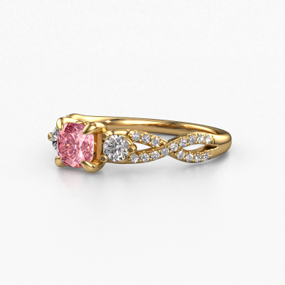 The ring shown above is called the Marilou CUS. We call this type of ring a 3-stone ring because it has one centre gemstone and a band that is also pave set with gemstones. The 14 Carat gold engagement ring is set with a cushion 5 mm pink lab grown diamond centre stone and the band is pave set with diamond gemstones. Each jewel is unique in every way! Simply customize to your liking,This traditional gold 3-stone engagement ring has an exquisite cushion pink lab grown diamond centre stone. To further accentuate the centre stone, the band is fully set with more diamonds. Its open prong setting allows light to strike the pink lab grown diamond from various angles and this adds sparkle to your pink lab grown diamond ring. The photo shown above depicts the goldsmith's carefully handcrafted details of the ring. The high positioning of the centre stone is truly eye-catching. The perfect engagement ring for the crown jewel of your life! By using a combination of the latest modern techniques, combined with ancient crafting, we can make all our engagement rings in our own studio. Each jewel is made to order. This is advantageous because we can offer you a price you won't find anywhere else.Our team adds new designs to our online collection daily. Our designers and goldsmiths work together in creating the best design. We strive to offer a diverse collection of jewels. Perhaps you have a specific jewel design in mind. One you came across somewhere. Please contact us for a free consultation. We will make you an offer, based on a fair price/ quality ratio, that will baffle you.To make it easier for you, we offer a 30 day return policy. Check our terms and conditions.