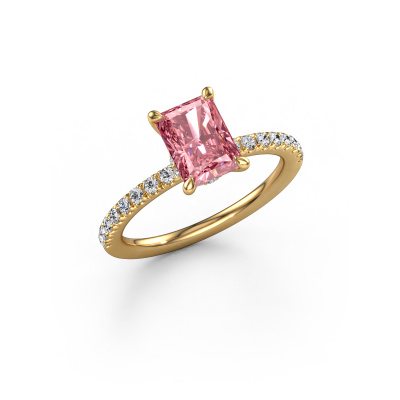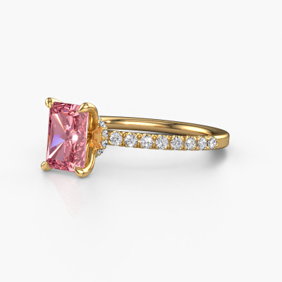 The ring shown above is called the Crystal RAD 4. We call this type of ring a pavé solitaire ring because it has one centre gemstone and a band that is also pave set with gemstones. The 14 Carat gold engagement ring is set with a radiant 7.5x5.5 mm pink lab grown diamond centre stone and the band is pave set with lab grown diamond gemstones. Each jewel is made with passion and love by one of our master goldsmiths.This fashionable gold pavé solitaire engagement ring has an exquisite radiant pink lab grown diamond centre stone. To further accentuate the centre stone, the band is fully set with more lab-grown diamonds. Its open prong setting allows light to strike the pink lab grown diamond from various angles and this adds sparkle to your pink lab grown diamond ring. The photo shown above depicts the goldsmith's carefully handcrafted details of the ring. The high positioning of the centre stone is truly eye-catching. The perfect engagement ring for the crown jewel of your life! After receiving your order, our goldsmiths will passionately start the creative process of making your engagement ring in our own studio. Because we don't have a big stockpile, these costs will not be passed on to you. Our pricing is proof of that! We offer top quality jewels at lowest price, guaranteed.Do you have a specific ring in mind? One you came across somewhere. Please feel free to tell us your wishes and we will turn your design into a unique engagement ring. You can follow the development of your ring design because we use 3D drawings. This gives you a realistic preview of your design. We will gladly send you a non-binding offer, based on a fair price/ quality ratio. It will amaze you.To make it easier for you, we offer a 30 day return policy. Check our terms and conditions.
