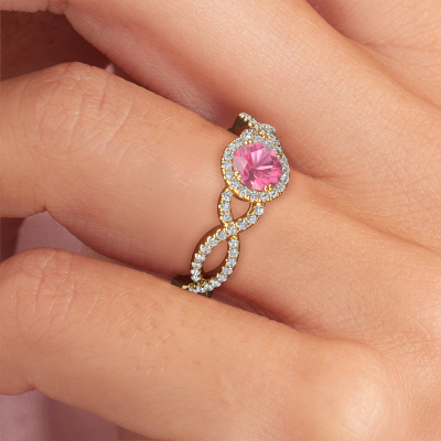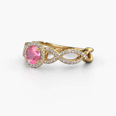 The ring shown above is called the Dionne rnd. We call this type of ring a pavé solitaire ring because it has one centre gemstone and a band that is also pave set with gemstones. The 14 Carat gold engagement ring is set with a round 5 mm pink sapphire centre stone and the band is pave set with diamond gemstones. Each jewel is made just for you by our master goldsmiths in our own studio.This classic gold pavé solitaire engagement ring has an exquisite round pink sapphire centre stone. To further accentuate the centre stone, the band is fully set with more diamonds. Its open prong setting allows light to strike the pink sapphire from various angles and this adds sparkle to your pink sapphire ring. The photo shown above depicts the goldsmith's carefully handcrafted details of the ring. The high positioning of the centre stone is truly eye-catching. The perfect engagement ring for the crown jewel of your life! Because we design and deliver our own rings, we can offer you a engagement ring at a price you won't find anywhere else. A ring is made to order, which helps prevent excess supplies, so we can make you a great price offer. We understand it feels risky, buying your engagement ring online, but we will gladly assist in the designing process, taking your budget into consideration.Do you have a specific ring in mind? One you came across somewhere. Please feel free to tell us your wishes and we will turn your design into a unique engagement ring. You can follow the development of your ring design because we use 3D drawings. This gives you a realistic preview of your design. We will gladly send you a non-binding offer, based on a fair price/ quality ratio. It will amaze you.To make it easier for you, we offer a 30 day return policy. Check our terms and conditions.