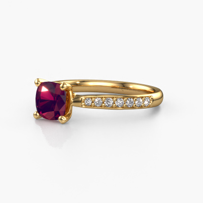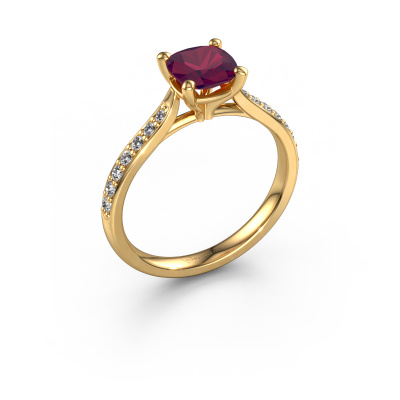 The ring shown above is called the Mignon cus 2. We call this type of ring a pavé solitaire ring because it has one centre gemstone and a band that is also pave set with gemstones. The 14 Carat gold engagement ring is set with a cushion 6 mm rhodolite centre stone and the band is pave set with lab grown diamond gemstones. Each jewel is made with passion and love by one of our master goldsmiths.This exclusive gold pavé solitaire engagement ring has an exquisite cushion rhodolite centre stone. To further accentuate the centre stone, the band is fully set with more lab-grown diamonds. Its open prong setting allows light to strike the rhodolite from various angles and this adds sparkle to your rhodolite ring. The photo shown above depicts the goldsmith's carefully handcrafted details of the ring. The high positioning of the centre stone is truly eye-catching. The perfect engagement ring for the crown jewel of your life! After receiving your order, our goldsmiths will start the creative process of making your Mignon cus 2 engagement ring. We don't keep stock. This is advantageous because these costs will not be passed on to you. Therefore, we can offer jewellery at exceptionally low prices.Our team adds new designs to our online collection daily. Our designers and goldsmiths work together in creating the best design. We strive to offer a diverse collection of jewels. Perhaps you have a specific jewel design in mind. One you came across somewhere. Please contact us for a free consultation. We will make you an offer, based on a fair price/ quality ratio, that will baffle you.To make it easier for you, we offer a 30 day return policy. Check our terms and conditions.