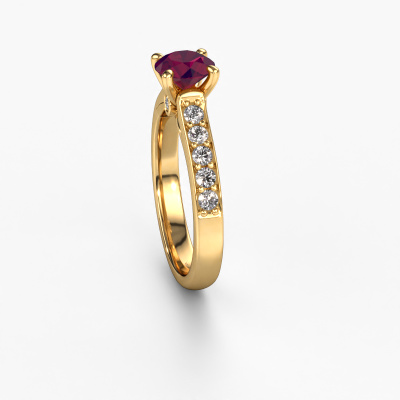 The ring shown above is called the Valorie RND 2. We call this type of ring a pavé solitaire ring because it has one centre gemstone and a band that is also pave set with gemstones. The 14 Carat gold engagement ring is set with a round 6.5 mm rhodolite centre stone and the band is pave set with lab grown diamond gemstones. Each jewel is made just for you, with attention to detail and design.This modern gold pavé solitaire engagement ring has an exquisite round rhodolite centre stone. To further accentuate the centre stone, the band is fully set with more lab-grown diamonds. Its open prong setting allows light to strike the rhodolite from various angles and this adds sparkle to your rhodolite ring. The photo shown above depicts the goldsmith's carefully handcrafted details of the ring. The high positioning of the centre stone is truly eye-catching. The perfect engagement ring for the crown jewel of your life! By using our modern techniques, we can design and customize the finest quality jewels with the utmost care for you. Our engagement rings are always priced 30 percent lower than other jewellers. We make engagement rings to order so we don't have to maintain a large stock. If you have a certain budget, we are more than happy to advice you accordingly.Our designers and goldsmiths work together each day, creating new jewels. Perhaps you have found a nice modern engagement ring somewhere, which can be used to customize your unique ring. Please feel free to contact us. We will make you an offer, based on a fair price/ quality ratio, which will amaze you.To make it easier for you, we offer a 30 day return policy. Check our terms and conditions.
