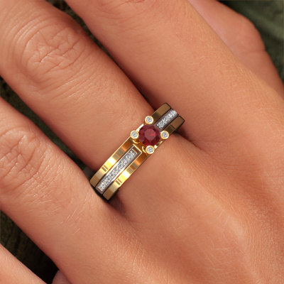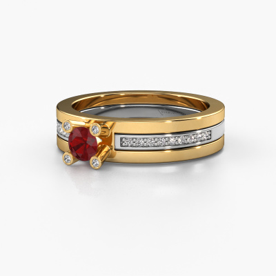 The ring shown above is called the Alisha. We call this type of ring a pavé solitaire ring because it has one centre gemstone and a band that is also pave set with gemstones. The 14 Carat gold engagement ring is set with a round 4 mm ruby centre stone and the band is pave set with diamond gemstones. Each jewel is unique in every way! Simply customize to your liking,This design gold pavé solitaire engagement ring has an exquisite round ruby centre stone. To further accentuate the centre stone, the band is fully set with more diamonds. Its open prong setting allows light to strike the ruby from various angles and this adds sparkle to your ruby ring. The photo shown above depicts the goldsmith's carefully handcrafted details of the ring. The high positioning of the centre stone is truly eye-catching. The perfect engagement ring for the crown jewel of your life! By using a combination of the latest modern techniques, combined with ancient crafting, we can make all our engagement rings in our own studio. Each jewel is made to order. This is advantageous because we can offer you a price you won't find anywhere else.Have you found a specific engagement ring somewhere which you would like to give to your loved one? Please feel free to express your wishes to our jewel designers because we would be honoured to turn your design into a design engagement ring. You can follow the development of your ring design because we use 3D drawings. This gives you a realistic preview of how your design will look. You can also preorder a dummy. A dummy is a plastic ring, which can be shaped according your ring design. You can try it on and check if its width and size are suitable for you. We will gladly send you a non-binding offer, based on a fair price/ quality ratio. It will amaze you, considering the quality of the ring and gemstones.To make it easier for you, we offer a 30 day return policy. Check our terms and conditions.