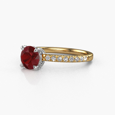 The ring shown above is called the Saskia rnd 1. We call this type of ring a pavé solitaire ring because it has one centre gemstone and a band that is also pave set with gemstones. The 14 Carat gold engagement ring is set with a round 6.5 mm ruby centre stone and the band is pave set with lab grown diamond gemstones. Each jewel is made with passion and love by one of our master goldsmiths.This exclusive gold pavé solitaire engagement ring has an exquisite round ruby centre stone. To further accentuate the centre stone, the band is fully set with more lab-grown diamonds. Its open prong setting allows light to strike the ruby from various angles and this adds sparkle to your ruby ring. The photo shown above depicts the goldsmith's carefully handcrafted details of the ring. The high positioning of the centre stone is truly eye-catching. The perfect engagement ring for the crown jewel of your life! By using a combination of the latest modern techniques, combined with ancient crafting, we can make all our engagement rings in our own studio. Each jewel is made to order. This is advantageous because we can offer you a price you won't find anywhere else.Do you have a specific ring in mind? One you came across somewhere. Please feel free to tell us your wishes and we will turn your design into a unique engagement ring. You can follow the development of your ring design because we use 3D drawings. This gives you a realistic preview of your design. We will gladly send you a non-binding offer, based on a fair price/ quality ratio. It will amaze you.To make it easier for you, we offer a 30 day return policy. Check our terms and conditions.