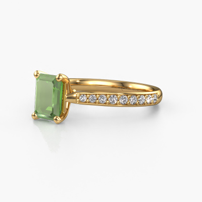 The ring shown above is called the Mignon eme 2. We call this type of ring a pavé solitaire ring because it has one centre gemstone and a band that is also pave set with gemstones. The 14 Carat gold engagement ring is set with a emerald cut 7x5 mm tourmaline green centre stone and the band is pave set with lab grown diamond gemstones. Each jewel is made just for you, with attention to detail and design.This exclusive gold pavé solitaire engagement ring has an exquisite emerald cut tourmaline green centre stone. To further accentuate the centre stone, the band is fully set with more lab-grown diamonds. Its open prong setting allows light to strike the tourmaline green from various angles and this adds sparkle to your tourmaline green ring. The photo shown above depicts the goldsmith's carefully handcrafted details of the ring. The high positioning of the centre stone is truly eye-catching. The perfect engagement ring for the crown jewel of your life! Are you on a budget? Please feel free to contact us, so we can go discuss your options. We offer our engagement rings at guaranteed best price, because we make them to order. You won't find such a price anywhere else!Do you have a specific ring in mind? One you came across somewhere. Please feel free to tell us your wishes and we will turn your design into a unique engagement ring. You can follow the development of your ring design because we use 3D drawings. This gives you a realistic preview of your design. We will gladly send you a non-binding offer, based on a fair price/ quality ratio. It will amaze you.To make it easier for you, we offer a 30 day return policy. Check our terms and conditions.