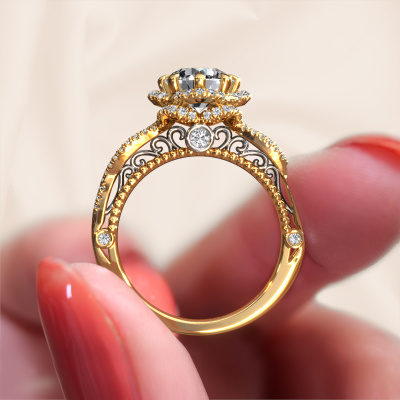This 14 Carat gold ring is called Lysanne and is set with 2.05 crt diamond. This filigree gold engagement ring is a true work of art! A beautifully adorned design of intricate wires. With dedication, patience and the utmost precision, our expert goldsmith will design a ring just for you. The adornment of small wiring is crafted to perfection by hand. It's a lengthy process which includes welding, crafting and polishing until our Goldsmiths are completely satisfied with the result: a perfect eye-catching ring that makes her shine with delight. Therefore the vintage filigree engagement ring is an extraordinary gift to bestow upon the love of your life. A handmade one-of-a-kind personalized ring, to be given to that special someone on that special moment when you pop the question. Isn't that wonderful? This piece of jewellery is made by a team of passionate goldsmiths and jewel designers. This will make your crown jewel truly eye-catching.After receiving your order, our goldsmiths will start the creative process of making your Lysanne engagement ring. We don't keep stock. This is advantageous because these costs will not be passed on to you. Therefore, we can offer jewellery at exceptionally low prices.Have you found a specific engagement ring somewhere which you would like to give to your loved one? Please feel free to express your wishes to our jewel designers because we would be honoured to turn your design into a vintage engagement ring. You can follow the development of your ring design because we use 3D drawings. This gives you a realistic preview of how your design will look. You can also preorder a dummy. A dummy is a plastic ring, which can be shaped according your ring design. You can try it on and check if its width and size are suitable for you. We will gladly send you a non-binding offer, based on a fair price/ quality ratio. It will amaze you, considering the quality of the ring and gemstones.To make it easier for you, we offer a 30 day return policy. Check our terms and conditions.