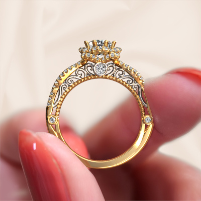 This 14 Carat gold ring is called Lysanne and is set with 1.050 crt diamond. This filigree gold engagement ring is a true work of art! A beautifully adorned design of intricate wires. With dedication, patience and the utmost precision, our expert goldsmith will design a ring just for you. The adornment of small wiring is crafted to perfection by hand. It's a lengthy process which includes welding, crafting and polishing until our Goldsmiths are completely satisfied with the result: a perfect eye-catching ring that makes her shine with delight. Therefore the vintage filigree engagement ring is an extraordinary gift to bestow upon the love of your life. A handmade one-of-a-kind personalized ring, to be given to that special someone on that special moment when you pop the question. Isn't that wonderful? This piece of jewellery is made by a team of passionate goldsmiths and jewel designers. This will make your crown jewel truly eye-catching.After receiving your order, our goldsmiths will start the creative process of making your Lysanne engagement ring. We don't keep stock. This is advantageous because these costs will not be passed on to you. Therefore, we can offer jewellery at exceptionally low prices.Have you found a specific engagement ring somewhere which you would like to give to your loved one? Please feel free to express your wishes to our jewel designers because we would be honoured to turn your design into a vintage engagement ring. You can follow the development of your ring design because we use 3D drawings. This gives you a realistic preview of how your design will look. You can also preorder a dummy. A dummy is a plastic ring, which can be shaped according your ring design. You can try it on and check if its width and size are suitable for you. We will gladly send you a non-binding offer, based on a fair price/ quality ratio. It will amaze you, considering the quality of the ring and gemstones.To make it easier for you, we offer a 30 day return policy. Check our terms and conditions.
