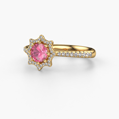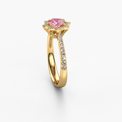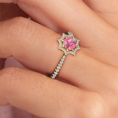 This 14 Carat gold ring is called Zena and is set with pink sapphire. An extraordinary gold vintage ring. One that will surely make the love of your life shine like a diamond! That is what we hope to achieve. This fantasy engagement ring is set with