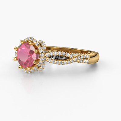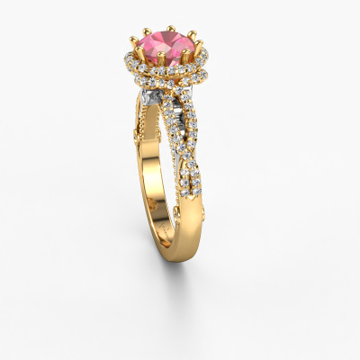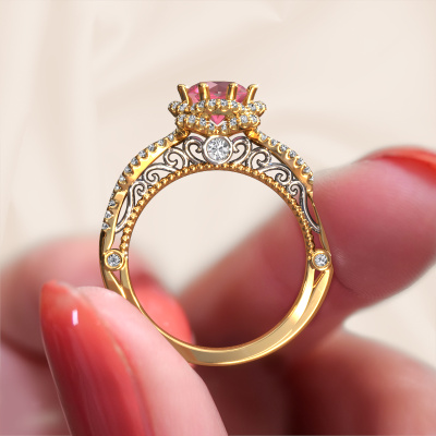 This 14 Carat gold ring is called Lysanne and is set with 6.5 mm tourmaline pink. This filigree gold engagement ring is a true work of art! A beautifully adorned design of intricate wires. With dedication, patience and the utmost precision, our expert goldsmith will design a ring just for you. The adornment of small wiring is crafted to perfection by hand. It's a lengthy process which includes welding, crafting and polishing until our Goldsmiths are completely satisfied with the result: a perfect eye-catching ring that makes her shine with delight. Therefore the vintage filigree engagement ring is an extraordinary gift to bestow upon the love of your life. A handmade one-of-a-kind personalized ring, to be given to that special someone on that special moment when you pop the question. Isn't that wonderful? This piece of jewellery is made by a team of passionate goldsmiths and jewel designers. This will make your crown jewel truly eye-catching.After receiving your order, our goldsmiths will start the creative process of making your Lysanne engagement ring. We don't keep stock. This is advantageous because these costs will not be passed on to you. Therefore, we can offer jewellery at exceptionally low prices.Have you found a specific engagement ring somewhere which you would like to give to your loved one? Please feel free to express your wishes to our jewel designers because we would be honoured to turn your design into a vintage engagement ring. You can follow the development of your ring design because we use 3D drawings. This gives you a realistic preview of how your design will look. You can also preorder a dummy. A dummy is a plastic ring, which can be shaped according your ring design. You can try it on and check if its width and size are suitable for you. We will gladly send you a non-binding offer, based on a fair price/ quality ratio. It will amaze you, considering the quality of the ring and gemstones.To make it easier for you, we offer a 30 day return policy. Check our terms and conditions.