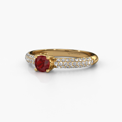 The ring shown above is called Marjan. We call this a pave ring. The smaller gemstones of pave ring are set in a close row which gives it an extra shine. This 14 Carat gold ring is set with ruby 4.2 mm. The ring shown above is called Marjan. We call this a pave ring. The smaller gemstones of pave ring are set in a close row which gives it an extra shine. Which emotion would you like to convey when you get down on one knee for her? This gold engagement ring is pave set with stunning ruby to represent your everlasting love. The gemstones are carefully hand selected and set by our goldsmith. The unique reflection of light on the ring can only be captured if the ruby are set in a perfect line. During the crafting and polishing of the jewellery, light fall is constantly monitored, until the expert goldsmith is satisfied with the result. A ring designed just for you to make your loved one shine bright like a diamond. Because there is only one special person fit to wear such a unique ring! With this meaningful piece of art, the symbol of infinity, you will prove your undying love for her and that you want to share the rest of your life with no one else. How will she be able to resist? This piece of jewellery is made just for you, with attention to detail and design.By using our modern techniques, we can design and customize the finest quality jewels with the utmost care for you. Our engagement rings are always priced 30 percent lower than other jewellers. We make engagement rings to order so we don't have to maintain a large stock. If you have a certain budget, we are more than happy to advice you accordingly.Have you found a specific engagement ring somewhere which you would like to give to your loved one? Please feel free to express your wishes to our jewel designers because we would be honoured to turn your design into a exclusive engagement ring. You can follow the development of your ring design because we use 3D drawings. This gives you a realistic preview of how your design will look. You can also preorder a dummy. A dummy is a plastic ring, which can be shaped according your ring design. You can try it on and check if its width and size are suitable for you. We will gladly send you a non-binding offer, based on a fair price/ quality ratio. It will amaze you, considering the quality of the ring and gemstones.To make it easier for you, we offer a 30 day return policy. Check our terms and conditions.