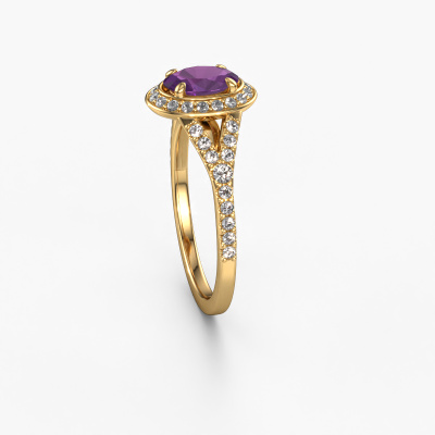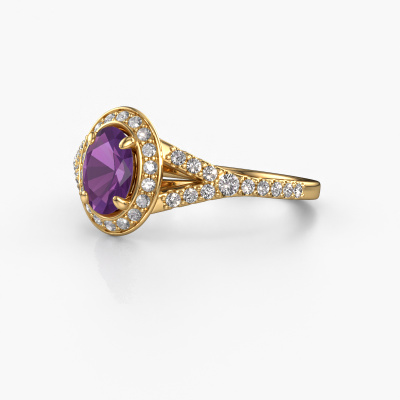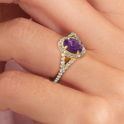The ring shown above is called the Pamela OVL. We call this type of ring a halo ring because it has one centre gemstone and a band that is also pave set with gemstones. The 14 Carat gold engagement ring is set with a oval 7x5 mm amethyst centre stone and the band is pave set with lab-grown diamonds. What makes this luxury gold halo ring special are the smaller sized stones embracing the centre stone. This gorgeous engagement ring is called a halo ring because the smaller gemstones give the centre stone a halo of surrounding light. In order for the smaller stones to enhance the centre stone, they have to be placed so there is no interference of light. And that's when our expert goldsmiths come in. Each individual stone is carefully set in the ring by hand. During manufacturing, light fall is constantly monitored to make sure the special halo is still visible. In the end you get a unique engagement ring, with a amethyst of your choosing at its centre. You can imagine the effect of a ring of such significance when you give it to her on her special day to shine. By using our modern techniques, we can design and customize the finest quality jewels with the utmost care for you. Our engagement rings are always priced 30 percent lower than other jewellers. We make engagement rings to order so we don't have to maintain a large stock. If you have a certain budget, we are more than happy to advice you accordingly.Our team adds new designs to our online collection daily. Our designers and goldsmiths work together in creating the best design. We strive to offer a diverse collection of jewels. Perhaps you have a specific jewel design in mind. One you came across somewhere. Please contact us for a free consultation. We will make you an offer, based on a fair price/ quality ratio, that will baffle you.To make it easier for you, we offer a 30 day return policy. Check our terms and conditions.