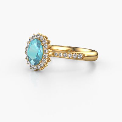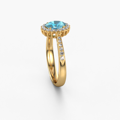The ring shown above is called the Tilly ovl 2. We call this type of ring a cluster ring, the centre gemstone is surrounded by smaller sized stones. This 14 Carat gold version is set with a 7x5 mm oval blue topaz centre stone, embraced by smaller lab-grown diamonds. If you look at this gold cluster engagement ring, you might get the impression that its smaller sized stones collide with the bigger blue topaz, so it is shaped like a flower. Therefore this engagement ring is also known as the flower ring. Our artisan goldsmiths get the job done. Each individual stone is carefully set by hand. During manufacturing, light fall is constantly monitored to make sure the special cluster effect is still visible. In the end you get the perfect engagement ring with a radiant blue topaz gemstone centrepiece. You can imagine the effect of a ring of such significance when you give tot the love of your life on her special day to shine. By using our modern techniques, we can design and customize the finest quality jewels with the utmost care for you. Our engagement rings are always priced 30 percent lower than other jewellers. We make engagement rings to order so we don't have to maintain a large stock. If you have a certain budget, we are more than happy to advice you accordingly.Different styles of new rings are made daily by our team. Perhaps you have found a cluster engagement ring somewhere. One you would like to give to your loved one. Please feel free to share your thoughts and design with our jewel designers. We would love to turn your design into a classic engagement ring. You can follow the development of your ring design because we use very detailed 3D drawings. On top of that, you can order a dummy of the design. A dummy is a plastic ring, which can be shaped according your ring design. You can try it on and check if the engagement ring is up to standard. We will gladly send you a non-binding offer, based on a fair price/ quality ratio. The offer will baffle you, considering the quality of the ring and gemstones.To make it easier for you, we offer a 30 day return policy. Check our terms and conditions.