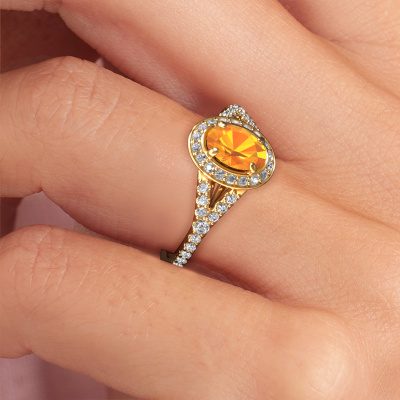 The ring shown above is called the Pamela OVL. We call this type of ring a halo ring because it has one centre gemstone and a band that is also pave set with gemstones. The 14 Carat gold engagement ring is set with a oval 7x5 mm citrin centre stone and the band is pave set with lab-grown diamonds. What makes this luxury gold halo ring special are the smaller sized stones embracing the centre stone. This gorgeous engagement ring is called a halo ring because the smaller gemstones give the centre stone a halo of surrounding light. In order for the smaller stones to enhance the centre stone, they have to be placed so there is no interference of light. And that's when our expert goldsmiths come in. Each individual stone is carefully set in the ring by hand. During manufacturing, light fall is constantly monitored to make sure the special halo is still visible. In the end you get a unique engagement ring, with a citrin of your choosing at its centre. You can imagine the effect of a ring of such significance when you give it to her on her special day to shine. By using our modern techniques, we can design and customize the finest quality jewels with the utmost care for you. Our engagement rings are always priced 30 percent lower than other jewellers. We make engagement rings to order so we don't have to maintain a large stock. If you have a certain budget, we are more than happy to advice you accordingly.Our team adds new designs to our online collection daily. Our designers and goldsmiths work together in creating the best design. We strive to offer a diverse collection of jewels. Perhaps you have a specific jewel design in mind. One you came across somewhere. Please contact us for a free consultation. We will make you an offer, based on a fair price/ quality ratio, that will baffle you.To make it easier for you, we offer a 30 day return policy. Check our terms and conditions.