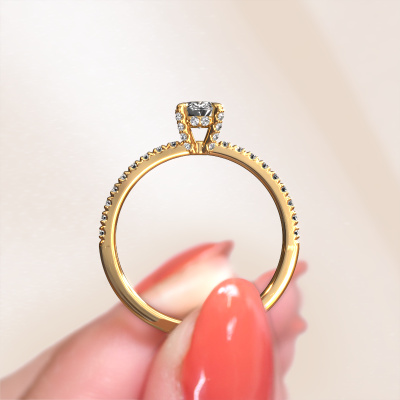 This 14 Carat gold ring is called Saskia 1 ovl and is set with 0.87 crt diamond. Does your girlfriend fancy exclusive jewellery? Or would you like to show her that she deserves the finest jewellery? This gold ring is pure craftsmanship, love and passion combined with the latest techniques coming together in perfect harmony. It requires a keen eye, patience and a skilful hand to mould this ring into perfection. Just the job for our expert goldsmith! The diamonds set gemstones gives this gold ring an extra glamorous appearance. Customize the style of the daring engagement ring to her liking with a wide variety of precious metals and gemstones which you select. That is how you create a unique ring for the most exclusive woman in your life! This jewel is made by a team of passionate goldsmiths and jewel designers. This will make your crown jewel truly eye-catching.After receiving your order, our goldsmiths will passionately start the creative process of making your engagement ring in our own studio. Because we don't have a big stockpile, these costs will not be passed on to you. Our pricing is proof of that! We offer top quality jewels at lowest price, guaranteed.Different styles of new rings are made daily by our team. Perhaps you have found a pavé solitaire engagement ring somewhere. One you would like to give to your loved one. Please feel free to share your thoughts and design with our jewel designers. We would love to turn your design into a luxury engagement ring. You can follow the development of your ring design because we use very detailed 3D drawings. On top of that, you can order a dummy of the design. A dummy is a plastic ring, which can be shaped according your ring design. You can try it on and check if the engagement ring is up to standard. We will gladly send you a non-binding offer, based on a fair price/ quality ratio. The offer will baffle you, considering the quality of the ring and gemstones.To make it easier for you, we offer a 30 day return policy. Check our terms and conditions.
