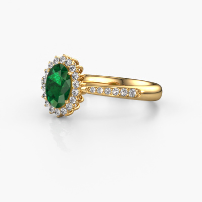 The ring shown above is called the Tilly ovl 2. We call this type of ring a cluster ring, the centre gemstone is surrounded by smaller sized stones. This 14 Carat gold version is set with a 7x5 mm oval emerald centre stone, embraced by smaller lab-grown diamonds. If you look at this gold cluster engagement ring, you might get the impression that its smaller sized stones collide with the bigger emerald, so it is shaped like a flower. Therefore this engagement ring is also known as the flower ring. Our artisan goldsmiths get the job done. Each individual stone is carefully set by hand. During manufacturing, light fall is constantly monitored to make sure the special cluster effect is still visible. In the end you get the perfect engagement ring with a radiant emerald gemstone centrepiece. You can imagine the effect of a ring of such significance when you give tot the love of your life on her special day to shine. By using our modern techniques, we can design and customize the finest quality jewels with the utmost care for you. Our engagement rings are always priced 30 percent lower than other jewellers. We make engagement rings to order so we don't have to maintain a large stock. If you have a certain budget, we are more than happy to advice you accordingly.Different styles of new rings are made daily by our team. Perhaps you have found a cluster engagement ring somewhere. One you would like to give to your loved one. Please feel free to share your thoughts and design with our jewel designers. We would love to turn your design into a classic engagement ring. You can follow the development of your ring design because we use very detailed 3D drawings. On top of that, you can order a dummy of the design. A dummy is a plastic ring, which can be shaped according your ring design. You can try it on and check if the engagement ring is up to standard. We will gladly send you a non-binding offer, based on a fair price/ quality ratio. The offer will baffle you, considering the quality of the ring and gemstones.To make it easier for you, we offer a 30 day return policy. Check our terms and conditions.