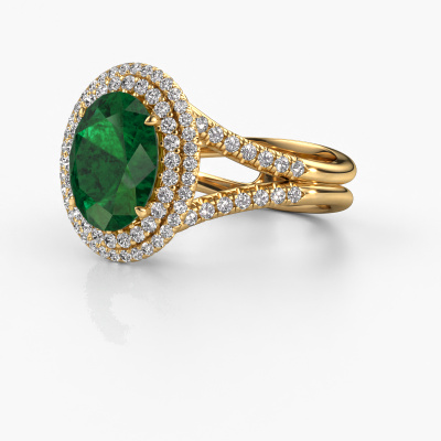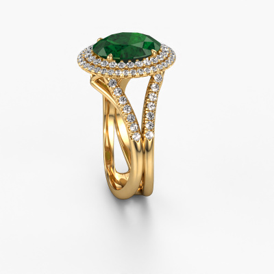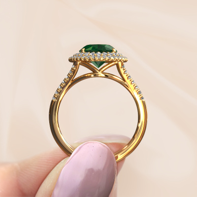 The ring shown above is called the Elvie. We call this type of ring a halo ring because it has one centre gemstone and a band that is also pave set with gemstones. The 14 Carat gold engagement ring is set with a oval 10x8 mm emerald centre stone and the band is pave set with lab-grown diamonds. What makes this vintage gold pavé solitaire ring special are the smaller sized stones embracing the centre stone. This gorgeous engagement ring is called a pavé solitaire ring because the smaller gemstones give the centre stone a pavé solitaire of surrounding light. In order for the smaller stones to enhance the centre stone, they have to be placed so there is no interference of light. And that's when our expert goldsmiths come in. Each individual stone is carefully set in the ring by hand. During manufacturing, light fall is constantly monitored to make sure the special pavé solitaire is still visible. In the end you get a unique engagement ring, with a emerald of your choosing at its centre. You can imagine the effect of a ring of such significance when you give it to her on her special day to shine. By using our modern techniques, we can design and customize the finest quality jewels with the utmost care for you. Our engagement rings are always priced 30 percent lower than other jewellers. We make engagement rings to order so we don't have to maintain a large stock. If you have a certain budget, we are more than happy to advice you accordingly.Do you have a specific ring in mind? One you came across somewhere. Please feel free to tell us your wishes and we will turn your design into a unique engagement ring. You can follow the development of your ring design because we use 3D drawings. This gives you a realistic preview of your design. We will gladly send you a non-binding offer, based on a fair price/ quality ratio. It will amaze you.To make it easier for you, we offer a 30 day return policy. Check our terms and conditions.