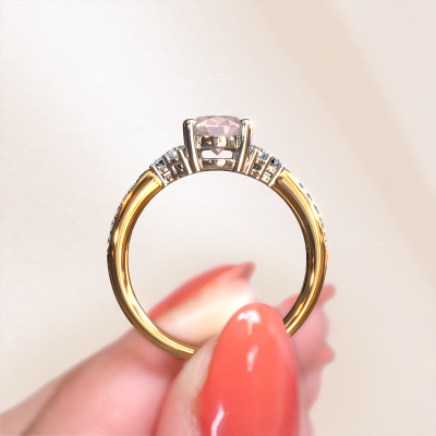 This 14 Carat gold ring is called Aleida OVL 2 and is set with 8x6 mm morganite champagne. Does your girlfriend fancy exclusive jewellery? Or would you like to show her that she deserves the finest jewellery? This gold ring is pure craftsmanship, love and passion combined with the latest techniques coming together in perfect harmony. It requires a keen eye, patience and a skilful hand to mould this ring into perfection. Just the job for our expert goldsmith! The morganite champagne set gemstones gives this gold ring an extra glamorous appearance. Customize the style of the charming engagement ring to her liking with a wide variety of precious metals and gemstones which you select. That is how you create a unique ring for the most exclusive woman in your life! This jewel is made just for you by our master goldsmiths in our own studio.By using a combination of the latest modern techniques, combined with ancient crafting, we can make all our engagement rings in our own studio. Each jewel is made to order. This is advantageous because we can offer you a price you won't find anywhere else.Do you have a specific ring in mind? One you came across somewhere. Please feel free to tell us your wishes and we will turn your design into a unique engagement ring. You can follow the development of your ring design because we use 3D drawings. This gives you a realistic preview of your design. We will gladly send you a non-binding offer, based on a fair price/ quality ratio. It will amaze you.To make it easier for you, we offer a 30 day return policy. Check our terms and conditions.