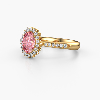 The ring shown above is called the Tilly ovl 2. We call this type of ring a cluster ring, the centre gemstone is surrounded by smaller sized stones. This 14 Carat gold version is set with a 7x5 mm oval pink lab grown diamond centre stone, embraced by smaller lab-grown diamonds. If you look at this gold cluster engagement ring, you might get the impression that its smaller sized stones collide with the bigger pink lab grown diamond, so it is shaped like a flower. Therefore this engagement ring is also known as the flower ring. Our artisan goldsmiths get the job done. Each individual stone is carefully set by hand. During manufacturing, light fall is constantly monitored to make sure the special cluster effect is still visible. In the end you get the perfect engagement ring with a radiant pink lab grown diamond gemstone centrepiece. You can imagine the effect of a ring of such significance when you give tot the love of your life on her special day to shine. By using our modern techniques, we can design and customize the finest quality jewels with the utmost care for you. Our engagement rings are always priced 30 percent lower than other jewellers. We make engagement rings to order so we don't have to maintain a large stock. If you have a certain budget, we are more than happy to advice you accordingly.Different styles of new rings are made daily by our team. Perhaps you have found a cluster engagement ring somewhere. One you would like to give to your loved one. Please feel free to share your thoughts and design with our jewel designers. We would love to turn your design into a classic engagement ring. You can follow the development of your ring design because we use very detailed 3D drawings. On top of that, you can order a dummy of the design. A dummy is a plastic ring, which can be shaped according your ring design. You can try it on and check if the engagement ring is up to standard. We will gladly send you a non-binding offer, based on a fair price/ quality ratio. The offer will baffle you, considering the quality of the ring and gemstones.To make it easier for you, we offer a 30 day return policy. Check our terms and conditions.