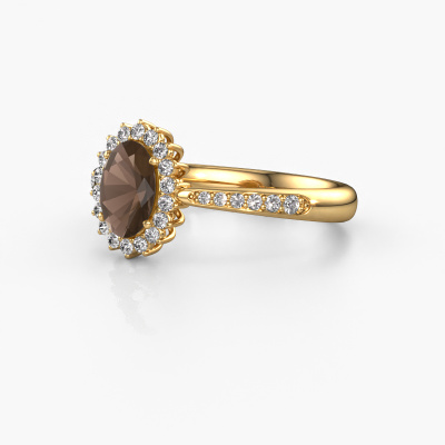 The ring shown above is called the Tilly ovl 2. We call this type of ring a cluster ring, the centre gemstone is surrounded by smaller sized stones. This 14 Carat gold version is set with a 7x5 mm oval smokey quartz centre stone, embraced by smaller lab-grown diamonds. If you look at this gold cluster engagement ring, you might get the impression that its smaller sized stones collide with the bigger smokey quartz, so it is shaped like a flower. Therefore this engagement ring is also known as the flower ring. Our artisan goldsmiths get the job done. Each individual stone is carefully set by hand. During manufacturing, light fall is constantly monitored to make sure the special cluster effect is still visible. In the end you get the perfect engagement ring with a radiant smokey quartz gemstone centrepiece. You can imagine the effect of a ring of such significance when you give tot the love of your life on her special day to shine. By using our modern techniques, we can design and customize the finest quality jewels with the utmost care for you. Our engagement rings are always priced 30 percent lower than other jewellers. We make engagement rings to order so we don't have to maintain a large stock. If you have a certain budget, we are more than happy to advice you accordingly.Different styles of new rings are made daily by our team. Perhaps you have found a cluster engagement ring somewhere. One you would like to give to your loved one. Please feel free to share your thoughts and design with our jewel designers. We would love to turn your design into a classic engagement ring. You can follow the development of your ring design because we use very detailed 3D drawings. On top of that, you can order a dummy of the design. A dummy is a plastic ring, which can be shaped according your ring design. You can try it on and check if the engagement ring is up to standard. We will gladly send you a non-binding offer, based on a fair price/ quality ratio. The offer will baffle you, considering the quality of the ring and gemstones.To make it easier for you, we offer a 30 day return policy. Check our terms and conditions.