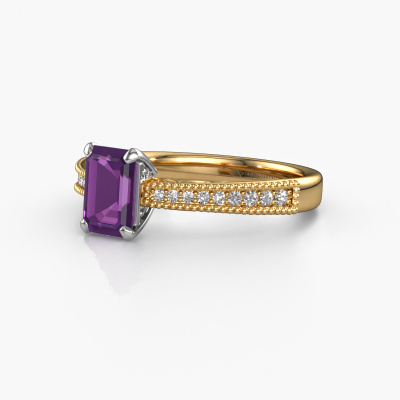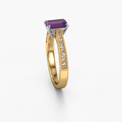 This 14 Carat gold ring is called Shonta EME and is set with amethyst. An extraordinary gold vintage ring. One that will surely make the love of your life shine like a diamond! That is what we hope to achieve. This vintage engagement ring is set with exquisite amethysten. Whichever gemstone you choose from our selection, is up to you. The gemstone is selected with great care because we believe your engagement ring must be adorned with nothing but the most beautiful gemstone. Wouldn't you agree? Our expert goldsmith will design your ring in our own artisan studio, where the amethyst will be set with great precision. The ring will then be polished till it is absolutely perfect. Nothing but the best for the love of your life! This jewel is made by a team of passionate goldsmiths and jewel designers. This will make your crown jewel truly eye-catching.Are you on a budget? Please feel free to contact us, so we can go discuss your options. We offer our engagement rings at guaranteed best price, because we make them to order. You won't find such a price anywhere else!Have you found a specific engagement ring somewhere which you would like to give to your loved one? Please feel free to express your wishes to our jewel designers because we would be honoured to turn your design into a vintage engagement ring. You can follow the development of your ring design because we use 3D drawings. This gives you a realistic preview of how your design will look. You can also preorder a dummy. A dummy is a plastic ring, which can be shaped according your ring design. You can try it on and check if its width and size are suitable for you. We will gladly send you a non-binding offer, based on a fair price/ quality ratio. It will amaze you, considering the quality of the ring and gemstones.To make it easier for you, we offer a 30 day return policy. Check our terms and conditions.