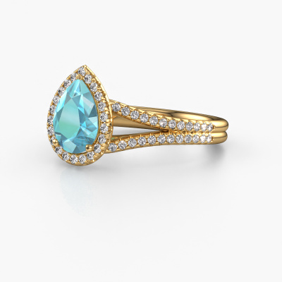 The ring shown above is called the Verla pear 2. We call this type of ring a halo ring because it has one centre gemstone and a band that is also pave set with gemstones. The 14 Carat gold engagement ring is set with a pear 8x6 mm blue topaz centre stone and the band is pave set with diamonds. What makes this exclusive gold halo ring special are the smaller sized stones embracing the centre stone. This gorgeous engagement ring is called a halo ring because the smaller gemstones give the centre stone a halo of surrounding light. In order for the smaller stones to enhance the centre stone, they have to be placed so there is no interference of light. And that's when our expert goldsmiths come in. Each individual stone is carefully set in the ring by hand. During manufacturing, light fall is constantly monitored to make sure the special halo is still visible. In the end you get a unique engagement ring, with a blue topaz of your choosing at its centre. You can imagine the effect of a ring of such significance when you give it to her on her special day to shine. After receiving your order, our goldsmiths will passionately start the creative process of making your engagement ring in our own studio. Because we don't have a big stockpile, these costs will not be passed on to you. Our pricing is proof of that! We offer top quality jewels at lowest price, guaranteed.Our designers and goldsmiths work together each day, creating new jewels. Perhaps you have found a nice exclusive engagement ring somewhere, which can be used to customize your unique ring. Please feel free to contact us. We will make you an offer, based on a fair price/ quality ratio, which will amaze you.To make it easier for you, we offer a 30 day return policy. Check our terms and conditions.