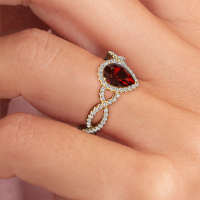 This 14 Carat gold ring is called Dionne pear and is set with 7x5 mm garnet. Does your girlfriend fancy exclusive jewellery? Or would you like to show her that she deserves the finest jewellery? This gold ring is pure craftsmanship, love and passion combined with the latest techniques coming together in perfect harmony. It requires a keen eye, patience and a skilful hand to mould this ring into perfection. Just the job for our expert goldsmith! The garnet set gemstones gives this gold ring an extra glamorous appearance. Customize the style of the twist engagement ring to her liking with a wide variety of precious metals and gemstones which you select. That is how you create a unique ring for the most exclusive woman in your life! This jewel is created to add sparkle to your finger, each jewel is lovingly made by hand by our goldsmiths.Are you on a budget? Please feel free to contact us, so we can go discuss your options. We offer our engagement rings at guaranteed best price, because we make them to order. You won't find such a price anywhere else!Different styles of new rings are made daily by our team. Perhaps you have found a pavé solitaire engagement ring somewhere. One you would like to give to your loved one. Please feel free to share your thoughts and design with our jewel designers. We would love to turn your design into a exclusive engagement ring. You can follow the development of your ring design because we use very detailed 3D drawings. On top of that, you can order a dummy of the design. A dummy is a plastic ring, which can be shaped according your ring design. You can try it on and check if the engagement ring is up to standard. We will gladly send you a non-binding offer, based on a fair price/ quality ratio. The offer will baffle you, considering the quality of the ring and gemstones.To make it easier for you, we offer a 30 day return policy. Check our terms and conditions.