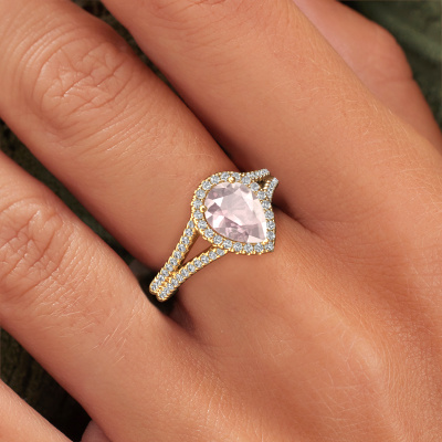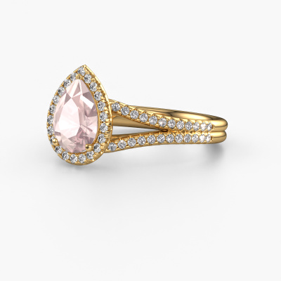 The ring shown above is called the Verla pear 2. We call this type of ring a halo ring because it has one centre gemstone and a band that is also pave set with gemstones. The 14 Carat gold engagement ring is set with a pear 8x6 mm morganite champagne centre stone and the band is pave set with diamonds. What makes this exclusive gold halo ring special are the smaller sized stones embracing the centre stone. This gorgeous engagement ring is called a halo ring because the smaller gemstones give the centre stone a halo of surrounding light. In order for the smaller stones to enhance the centre stone, they have to be placed so there is no interference of light. And that's when our expert goldsmiths come in. Each individual stone is carefully set in the ring by hand. During manufacturing, light fall is constantly monitored to make sure the special halo is still visible. In the end you get a unique engagement ring, with a morganite champagne of your choosing at its centre. You can imagine the effect of a ring of such significance when you give it to her on her special day to shine. After receiving your order, our goldsmiths will passionately start the creative process of making your engagement ring in our own studio. Because we don't have a big stockpile, these costs will not be passed on to you. Our pricing is proof of that! We offer top quality jewels at lowest price, guaranteed.Our designers and goldsmiths work together each day, creating new jewels. Perhaps you have found a nice exclusive engagement ring somewhere, which can be used to customize your unique ring. Please feel free to contact us. We will make you an offer, based on a fair price/ quality ratio, which will amaze you.To make it easier for you, we offer a 30 day return policy. Check our terms and conditions.