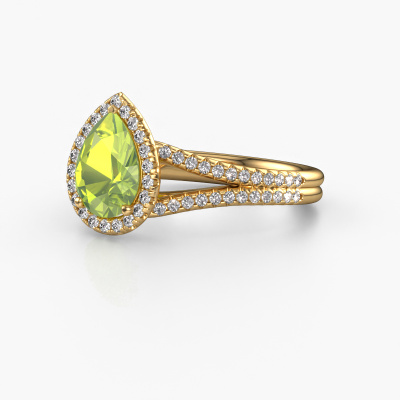 The ring shown above is called the Verla pear 2. We call this type of ring a halo ring because it has one centre gemstone and a band that is also pave set with gemstones. The 14 Carat gold engagement ring is set with a pear 8x6 mm peridot centre stone and the band is pave set with diamonds. What makes this exclusive gold halo ring special are the smaller sized stones embracing the centre stone. This gorgeous engagement ring is called a halo ring because the smaller gemstones give the centre stone a halo of surrounding light. In order for the smaller stones to enhance the centre stone, they have to be placed so there is no interference of light. And that's when our expert goldsmiths come in. Each individual stone is carefully set in the ring by hand. During manufacturing, light fall is constantly monitored to make sure the special halo is still visible. In the end you get a unique engagement ring, with a peridot of your choosing at its centre. You can imagine the effect of a ring of such significance when you give it to her on her special day to shine. After receiving your order, our goldsmiths will passionately start the creative process of making your engagement ring in our own studio. Because we don't have a big stockpile, these costs will not be passed on to you. Our pricing is proof of that! We offer top quality jewels at lowest price, guaranteed.Our designers and goldsmiths work together each day, creating new jewels. Perhaps you have found a nice exclusive engagement ring somewhere, which can be used to customize your unique ring. Please feel free to contact us. We will make you an offer, based on a fair price/ quality ratio, which will amaze you.To make it easier for you, we offer a 30 day return policy. Check our terms and conditions.