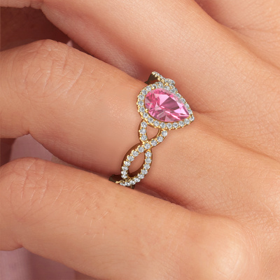 This 14 Carat gold ring is called Dionne pear and is set with 7x5 mm pink sapphire. Does your girlfriend fancy exclusive jewellery? Or would you like to show her that she deserves the finest jewellery? This gold ring is pure craftsmanship, love and passion combined with the latest techniques coming together in perfect harmony. It requires a keen eye, patience and a skilful hand to mould this ring into perfection. Just the job for our expert goldsmith! The pink sapphire set gemstones gives this gold ring an extra glamorous appearance. Customize the style of the twist engagement ring to her liking with a wide variety of precious metals and gemstones which you select. That is how you create a unique ring for the most exclusive woman in your life! This jewel is created to add sparkle to your finger, each jewel is lovingly made by hand by our goldsmiths.Are you on a budget? Please feel free to contact us, so we can go discuss your options. We offer our engagement rings at guaranteed best price, because we make them to order. You won't find such a price anywhere else!Different styles of new rings are made daily by our team. Perhaps you have found a pavé solitaire engagement ring somewhere. One you would like to give to your loved one. Please feel free to share your thoughts and design with our jewel designers. We would love to turn your design into a exclusive engagement ring. You can follow the development of your ring design because we use very detailed 3D drawings. On top of that, you can order a dummy of the design. A dummy is a plastic ring, which can be shaped according your ring design. You can try it on and check if the engagement ring is up to standard. We will gladly send you a non-binding offer, based on a fair price/ quality ratio. The offer will baffle you, considering the quality of the ring and gemstones.To make it easier for you, we offer a 30 day return policy. Check our terms and conditions.
