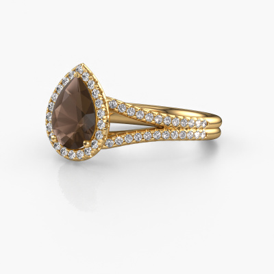 The ring shown above is called the Verla pear 2. We call this type of ring a halo ring because it has one centre gemstone and a band that is also pave set with gemstones. The 14 Carat gold engagement ring is set with a pear 8x6 mm smokey quartz centre stone and the band is pave set with diamonds. What makes this exclusive gold halo ring special are the smaller sized stones embracing the centre stone. This gorgeous engagement ring is called a halo ring because the smaller gemstones give the centre stone a halo of surrounding light. In order for the smaller stones to enhance the centre stone, they have to be placed so there is no interference of light. And that's when our expert goldsmiths come in. Each individual stone is carefully set in the ring by hand. During manufacturing, light fall is constantly monitored to make sure the special halo is still visible. In the end you get a unique engagement ring, with a smokey quartz of your choosing at its centre. You can imagine the effect of a ring of such significance when you give it to her on her special day to shine. After receiving your order, our goldsmiths will passionately start the creative process of making your engagement ring in our own studio. Because we don't have a big stockpile, these costs will not be passed on to you. Our pricing is proof of that! We offer top quality jewels at lowest price, guaranteed.Our designers and goldsmiths work together each day, creating new jewels. Perhaps you have found a nice exclusive engagement ring somewhere, which can be used to customize your unique ring. Please feel free to contact us. We will make you an offer, based on a fair price/ quality ratio, which will amaze you.To make it easier for you, we offer a 30 day return policy. Check our terms and conditions.