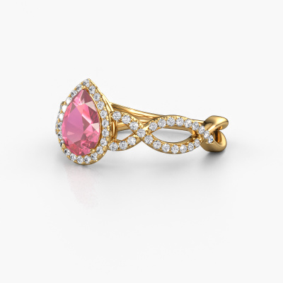 This 14 Carat gold ring is called Dionne pear and is set with 7x5 mm tourmaline pink. Does your girlfriend fancy exclusive jewellery? Or would you like to show her that she deserves the finest jewellery? This gold ring is pure craftsmanship, love and passion combined with the latest techniques coming together in perfect harmony. It requires a keen eye, patience and a skilful hand to mould this ring into perfection. Just the job for our expert goldsmith! The tourmaline pink set gemstones gives this gold ring an extra glamorous appearance. Customize the style of the twist engagement ring to her liking with a wide variety of precious metals and gemstones which you select. That is how you create a unique ring for the most exclusive woman in your life! This jewel is created to add sparkle to your finger, each jewel is lovingly made by hand by our goldsmiths.Are you on a budget? Please feel free to contact us, so we can go discuss your options. We offer our engagement rings at guaranteed best price, because we make them to order. You won't find such a price anywhere else!Different styles of new rings are made daily by our team. Perhaps you have found a pavé solitaire engagement ring somewhere. One you would like to give to your loved one. Please feel free to share your thoughts and design with our jewel designers. We would love to turn your design into a exclusive engagement ring. You can follow the development of your ring design because we use very detailed 3D drawings. On top of that, you can order a dummy of the design. A dummy is a plastic ring, which can be shaped according your ring design. You can try it on and check if the engagement ring is up to standard. We will gladly send you a non-binding offer, based on a fair price/ quality ratio. The offer will baffle you, considering the quality of the ring and gemstones.To make it easier for you, we offer a 30 day return policy. Check our terms and conditions.