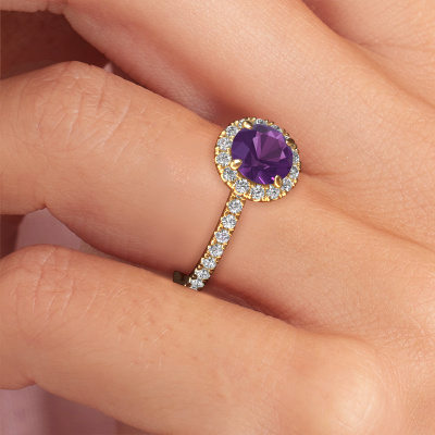 The ring shown above is called the Miranda rnd. We call this type of ring a halo ring because it has one centre gemstone and a band that is also pave set with gemstones. The 14 Carat gold engagement ring is set with a round 6.5 mm amethyst centre stone and the band is pave set with lab-grown diamonds. What makes this exclusive gold halo ring special are the smaller sized stones embracing the centre stone. This gorgeous engagement ring is called a halo ring because the smaller gemstones give the centre stone a halo of surrounding light. In order for the smaller stones to enhance the centre stone, they have to be placed so there is no interference of light. And that's when our expert goldsmiths come in. Each individual stone is carefully set in the ring by hand. During manufacturing, light fall is constantly monitored to make sure the special halo is still visible. In the end you get a unique engagement ring, with a amethyst of your choosing at its centre. You can imagine the effect of a ring of such significance when you give it to her on her special day to shine. By using our modern techniques, we can design and customize the finest quality jewels with the utmost care for you. Our engagement rings are always priced 30 percent lower than other jewellers. We make engagement rings to order so we don't have to maintain a large stock. If you have a certain budget, we are more than happy to advice you accordingly.Have you found a specific engagement ring somewhere which you would like to give to your loved one? Please feel free to express your wishes to our jewel designers because we would be honoured to turn your design into a exclusive engagement ring. You can follow the development of your ring design because we use 3D drawings. This gives you a realistic preview of how your design will look. You can also preorder a dummy. A dummy is a plastic ring, which can be shaped according your ring design. You can try it on and check if its width and size are suitable for you. We will gladly send you a non-binding offer, based on a fair price/ quality ratio. It will amaze you, considering the quality of the ring and gemstones.To make it easier for you, we offer a 30 day return policy. Check our terms and conditions.