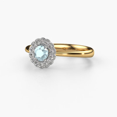 The ring shown above is called the Debi. We call this type of ring a halo ring because it has one centre gemstone and a band that is also pave set with gemstones. The 14 Carat gold engagement ring is set with a round 4.2 mm aquamarine centre stone and the band is pave set with diamonds. What makes this classic gold halo ring special are the smaller sized stones embracing the centre stone. This gorgeous engagement ring is called a halo ring because the smaller gemstones give the centre stone a halo of surrounding light. In order for the smaller stones to enhance the centre stone, they have to be placed so there is no interference of light. And that's when our expert goldsmiths come in. Each individual stone is carefully set in the ring by hand. During manufacturing, light fall is constantly monitored to make sure the special halo is still visible. In the end you get a unique engagement ring, with a aquamarine of your choosing at its centre. You can imagine the effect of a ring of such significance when you give it to her on her special day to shine. Because we design and deliver our own rings, we can offer you a engagement ring at a price you won't find anywhere else. A ring is made to order, which helps prevent excess supplies, so we can make you a great price offer. We understand it feels risky, buying your engagement ring online, but we will gladly assist in the designing process, taking your budget into consideration.Our team adds new designs to our online collection daily. Our designers and goldsmiths work together in creating the best design. We strive to offer a diverse collection of jewels. Perhaps you have a specific jewel design in mind. One you came across somewhere. Please contact us for a free consultation. We will make you an offer, based on a fair price/ quality ratio, that will baffle you.To make it easier for you, we offer a 30 day return policy. Check our terms and conditions.