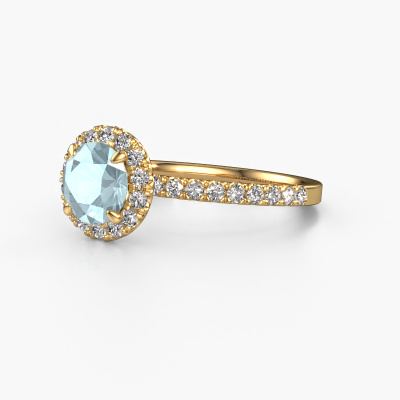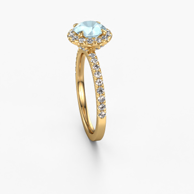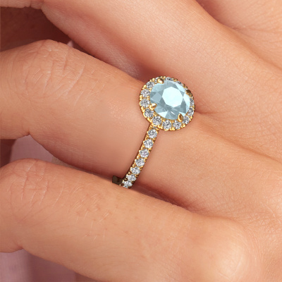 The ring shown above is called the Miranda rnd. We call this type of ring a halo ring because it has one centre gemstone and a band that is also pave set with gemstones. The 14 Carat gold engagement ring is set with a round 6.5 mm aquamarine centre stone and the band is pave set with lab-grown diamonds. What makes this exclusive gold halo ring special are the smaller sized stones embracing the centre stone. This gorgeous engagement ring is called a halo ring because the smaller gemstones give the centre stone a halo of surrounding light. In order for the smaller stones to enhance the centre stone, they have to be placed so there is no interference of light. And that's when our expert goldsmiths come in. Each individual stone is carefully set in the ring by hand. During manufacturing, light fall is constantly monitored to make sure the special halo is still visible. In the end you get a unique engagement ring, with a aquamarine of your choosing at its centre. You can imagine the effect of a ring of such significance when you give it to her on her special day to shine. By using our modern techniques, we can design and customize the finest quality jewels with the utmost care for you. Our engagement rings are always priced 30 percent lower than other jewellers. We make engagement rings to order so we don't have to maintain a large stock. If you have a certain budget, we are more than happy to advice you accordingly.Have you found a specific engagement ring somewhere which you would like to give to your loved one? Please feel free to express your wishes to our jewel designers because we would be honoured to turn your design into a exclusive engagement ring. You can follow the development of your ring design because we use 3D drawings. This gives you a realistic preview of how your design will look. You can also preorder a dummy. A dummy is a plastic ring, which can be shaped according your ring design. You can try it on and check if its width and size are suitable for you. We will gladly send you a non-binding offer, based on a fair price/ quality ratio. It will amaze you, considering the quality of the ring and gemstones.To make it easier for you, we offer a 30 day return policy. Check our terms and conditions.