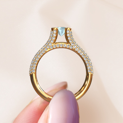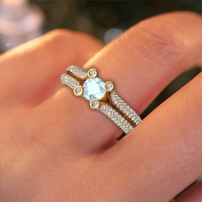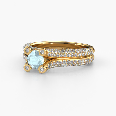 This 14 Carat gold ring is called Stefanie 2 and is set with 5 mm aquamarine. Does your girlfriend fancy exclusive jewellery? Or would you like to show her that she deserves the finest jewellery? This gold ring is pure craftsmanship, love and passion combined with the latest techniques coming together in perfect harmony. It requires a keen eye, patience and a skilful hand to mould this ring into perfection. Just the job for our expert goldsmith! The aquamarine set gemstones gives this gold ring an extra glamorous appearance. Customize the style of the split band engagement ring to her liking with a wide variety of precious metals and gemstones which you select. That is how you create a unique ring for the most exclusive woman in your life! This jewel is made just for you by our master goldsmiths in our own studio.After receiving your order, our goldsmiths will passionately start the creative process of making your engagement ring in our own studio. Because we don't have a big stockpile, these costs will not be passed on to you. Our pricing is proof of that! We offer top quality jewels at lowest price, guaranteed.Different styles of new rings are made daily by our team. Perhaps you have found a pavé solitaire engagement ring somewhere. One you would like to give to your loved one. Please feel free to share your thoughts and design with our jewel designers. We would love to turn your design into a unique engagement ring. You can follow the development of your ring design because we use very detailed 3D drawings. On top of that, you can order a dummy of the design. A dummy is a plastic ring, which can be shaped according your ring design. You can try it on and check if the engagement ring is up to standard. We will gladly send you a non-binding offer, based on a fair price/ quality ratio. The offer will baffle you, considering the quality of the ring and gemstones.To make it easier for you, we offer a 30 day return policy. Check our terms and conditions.
