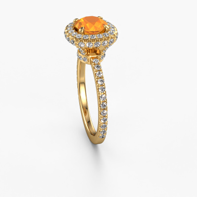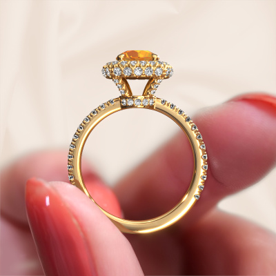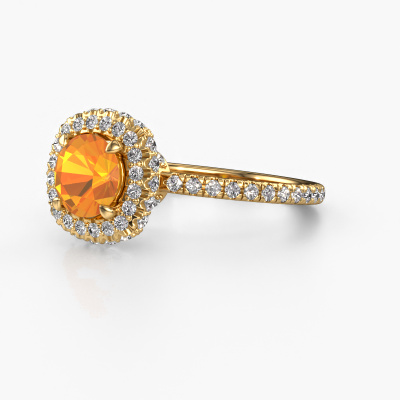 The ring shown above is called the Talitha RND. We call this type of ring a halo ring because it has one centre gemstone and a band that is also pave set with gemstones. The 14 Carat gold engagement ring is set with a round 6.5 mm citrin centre stone and the band is pave set with lab-grown diamonds. What makes this exclusive gold halo ring special are the smaller sized stones embracing the centre stone. This gorgeous engagement ring is called a halo ring because the smaller gemstones give the centre stone a halo of surrounding light. In order for the smaller stones to enhance the centre stone, they have to be placed so there is no interference of light. And that's when our expert goldsmiths come in. Each individual stone is carefully set in the ring by hand. During manufacturing, light fall is constantly monitored to make sure the special halo is still visible. In the end you get a unique engagement ring, with a citrin of your choosing at its centre. You can imagine the effect of a ring of such significance when you give it to her on her special day to shine. Are you on a budget? Please feel free to contact us, so we can go discuss your options. We offer our engagement rings at guaranteed best price, because we make them to order. You won't find such a price anywhere else!Our team adds new designs to our online collection daily. Our designers and goldsmiths work together in creating the best design. We strive to offer a diverse collection of jewels. Perhaps you have a specific jewel design in mind. One you came across somewhere. Please contact us for a free consultation. We will make you an offer, based on a fair price/ quality ratio, that will baffle you.To make it easier for you, we offer a 30 day return policy. Check our terms and conditions.