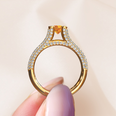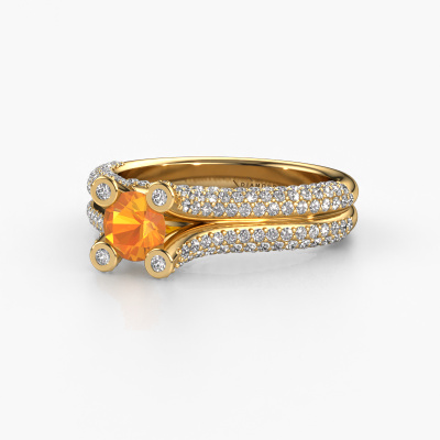 This 14 Carat gold ring is called Stefanie 2 and is set with 5 mm citrin. Does your girlfriend fancy exclusive jewellery? Or would you like to show her that she deserves the finest jewellery? This gold ring is pure craftsmanship, love and passion combined with the latest techniques coming together in perfect harmony. It requires a keen eye, patience and a skilful hand to mould this ring into perfection. Just the job for our expert goldsmith! The citrin set gemstones gives this gold ring an extra glamorous appearance. Customize the style of the split band engagement ring to her liking with a wide variety of precious metals and gemstones which you select. That is how you create a unique ring for the most exclusive woman in your life! This jewel is made just for you by our master goldsmiths in our own studio.After receiving your order, our goldsmiths will passionately start the creative process of making your engagement ring in our own studio. Because we don't have a big stockpile, these costs will not be passed on to you. Our pricing is proof of that! We offer top quality jewels at lowest price, guaranteed.Different styles of new rings are made daily by our team. Perhaps you have found a pavé solitaire engagement ring somewhere. One you would like to give to your loved one. Please feel free to share your thoughts and design with our jewel designers. We would love to turn your design into a unique engagement ring. You can follow the development of your ring design because we use very detailed 3D drawings. On top of that, you can order a dummy of the design. A dummy is a plastic ring, which can be shaped according your ring design. You can try it on and check if the engagement ring is up to standard. We will gladly send you a non-binding offer, based on a fair price/ quality ratio. The offer will baffle you, considering the quality of the ring and gemstones.To make it easier for you, we offer a 30 day return policy. Check our terms and conditions.