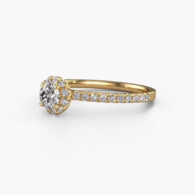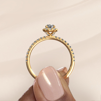 The ring shown above is called the Miranda rnd. We call this type of ring a halo ring because it has one centre gemstone and a band that is also pave set with gemstones. The 14 Carat gold engagement ring is set with a round 0.30 crt diamond centre stone and the band is pave set with lab-grown diamonds. What makes this exclusive gold halo ring special are the smaller sized stones embracing the centre stone. This gorgeous engagement ring is called a halo ring because the smaller gemstones give the centre stone a halo of surrounding light. In order for the smaller stones to enhance the centre stone, they have to be placed so there is no interference of light. And that's when our expert goldsmiths come in. Each individual stone is carefully set in the ring by hand. During manufacturing, light fall is constantly monitored to make sure the special halo is still visible. In the end you get a unique engagement ring, with a diamond of your choosing at its centre. You can imagine the effect of a ring of such significance when you give it to her on her special day to shine. By using our modern techniques, we can design and customize the finest quality jewels with the utmost care for you. Our engagement rings are always priced 30 percent lower than other jewellers. We make engagement rings to order so we don't have to maintain a large stock. If you have a certain budget, we are more than happy to advice you accordingly.Have you found a specific engagement ring somewhere which you would like to give to your loved one? Please feel free to express your wishes to our jewel designers because we would be honoured to turn your design into a exclusive engagement ring. You can follow the development of your ring design because we use 3D drawings. This gives you a realistic preview of how your design will look. You can also preorder a dummy. A dummy is a plastic ring, which can be shaped according your ring design. You can try it on and check if its width and size are suitable for you. We will gladly send you a non-binding offer, based on a fair price/ quality ratio. It will amaze you, considering the quality of the ring and gemstones.To make it easier for you, we offer a 30 day return policy. Check our terms and conditions.