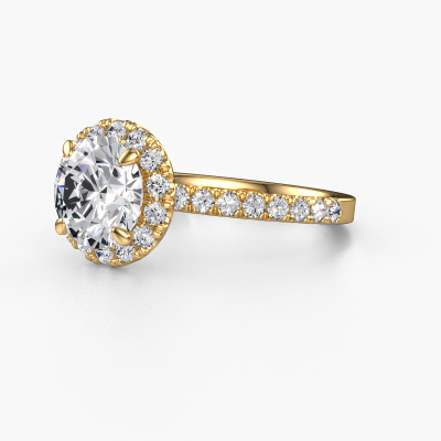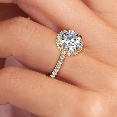 The ring shown above is called the Miranda RND. We call this type of ring a halo ring because it has one centre gemstone and a band that is also pave set with gemstones. The 14 Carat gold engagement ring is set with a round 2.00 crt diamond centre stone and the band is pave set with lab-grown diamonds. What makes this exclusive gold halo ring special are the smaller sized stones embracing the centre stone. This gorgeous engagement ring is called a halo ring because the smaller gemstones give the centre stone a halo of surrounding light. In order for the smaller stones to enhance the centre stone, they have to be placed so there is no interference of light. And that's when our expert goldsmiths come in. Each individual stone is carefully set in the ring by hand. During manufacturing, light fall is constantly monitored to make sure the special halo is still visible. In the end you get a unique engagement ring, with a diamond of your choosing at its centre. You can imagine the effect of a ring of such significance when you give it to her on her special day to shine. By using our modern techniques, we can design and customize the finest quality jewels with the utmost care for you. Our engagement rings are always priced 30 percent lower than other jewellers. We make engagement rings to order so we don't have to maintain a large stock. If you have a certain budget, we are more than happy to advice you accordingly.Have you found a specific engagement ring somewhere which you would like to give to your loved one? Please feel free to express your wishes to our jewel designers because we would be honoured to turn your design into a exclusive engagement ring. You can follow the development of your ring design because we use 3D drawings. This gives you a realistic preview of how your design will look. You can also preorder a dummy. A dummy is a plastic ring, which can be shaped according your ring design. You can try it on and check if its width and size are suitable for you. We will gladly send you a non-binding offer, based on a fair price/ quality ratio. It will amaze you, considering the quality of the ring and gemstones.To make it easier for you, we offer a 30 day return policy. Check our terms and conditions.