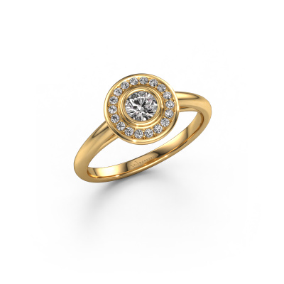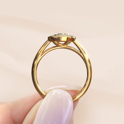 The ring shown above is called the Noud 1 RND. We call this type of ring a halo ring because it has one centre gemstone and a band that is also pave set with gemstones. The 14 Carat gold promise ring is set with a round 0.25 crt diamond centre stone and the band is pave set with diamonds. What makes this traditional gold halo ring special are the smaller sized stones embracing the centre stone. This gorgeous promise ring is called a halo ring because the smaller gemstones give the centre stone a halo of surrounding light. In order for the smaller stones to enhance the centre stone, they have to be placed so there is no interference of light. And that's when our expert goldsmiths come in. Each individual stone is carefully set in the ring by hand. During manufacturing, light fall is constantly monitored to make sure the special halo is still visible. In the end you get a unique promise ring, with a diamond of your choosing at its centre. You can imagine the effect of a ring of such significance when you give it to her on her special day to shine. By using a combination of the latest modern techniques, combined with ancient crafting, we can make all our promise ring in our own studio. Each jewel is made to order. This is advantageous because we can offer you a price you won't find anywhere else.Do you have a specific ring in mind? One you came across somewhere. Please feel free to tell us your wishes and we will turn your design into a unique promise ring. You can follow the development of your ring design because we use 3D drawings. This gives you a realistic preview of your design. We will gladly send you a non-binding offer, based on a fair price/ quality ratio. It will amaze you.To make it easier for you, we offer a 30 day return policy. Check our terms and conditions.