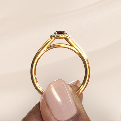 The ring shown above is called the Verla rnd 1. We call this type of ring a halo ring because it has one centre gemstone and a band that is also pave set with gemstones. The 14 Carat gold engagement ring is set with a round 4.7 mm garnet centre stone and the band is pave set with diamonds. What makes this classic gold halo ring special are the smaller sized stones embracing the centre stone. This gorgeous engagement ring is called a halo ring because the smaller gemstones give the centre stone a halo of surrounding light. In order for the smaller stones to enhance the centre stone, they have to be placed so there is no interference of light. And that's when our expert goldsmiths come in. Each individual stone is carefully set in the ring by hand. During manufacturing, light fall is constantly monitored to make sure the special halo is still visible. In the end you get a unique engagement ring, with a garnet of your choosing at its centre. You can imagine the effect of a ring of such significance when you give it to her on her special day to shine. By using a combination of the latest modern techniques, combined with ancient crafting, we can make all our engagement rings in our own studio. Each jewel is made to order. This is advantageous because we can offer you a price you won't find anywhere else.Our team adds new designs to our online collection daily. Our designers and goldsmiths work together in creating the best design. We strive to offer a diverse collection of jewels. Perhaps you have a specific jewel design in mind. One you came across somewhere. Please contact us for a free consultation. We will make you an offer, based on a fair price/ quality ratio, that will baffle you.To make it easier for you, we offer a 30 day return policy. Check our terms and conditions.