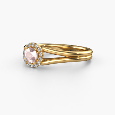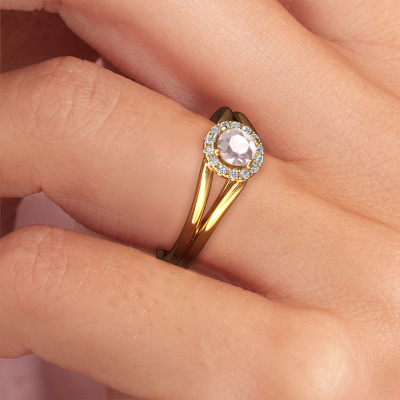 The ring shown above is called the Verla rnd 1. We call this type of ring a halo ring because it has one centre gemstone and a band that is also pave set with gemstones. The 14 Carat gold engagement ring is set with a round 4.7 mm morganite champagne centre stone and the band is pave set with diamonds. What makes this classic gold halo ring special are the smaller sized stones embracing the centre stone. This gorgeous engagement ring is called a halo ring because the smaller gemstones give the centre stone a halo of surrounding light. In order for the smaller stones to enhance the centre stone, they have to be placed so there is no interference of light. And that's when our expert goldsmiths come in. Each individual stone is carefully set in the ring by hand. During manufacturing, light fall is constantly monitored to make sure the special halo is still visible. In the end you get a unique engagement ring, with a morganite champagne of your choosing at its centre. You can imagine the effect of a ring of such significance when you give it to her on her special day to shine. By using a combination of the latest modern techniques, combined with ancient crafting, we can make all our engagement rings in our own studio. Each jewel is made to order. This is advantageous because we can offer you a price you won't find anywhere else.Our team adds new designs to our online collection daily. Our designers and goldsmiths work together in creating the best design. We strive to offer a diverse collection of jewels. Perhaps you have a specific jewel design in mind. One you came across somewhere. Please contact us for a free consultation. We will make you an offer, based on a fair price/ quality ratio, that will baffle you.To make it easier for you, we offer a 30 day return policy. Check our terms and conditions.