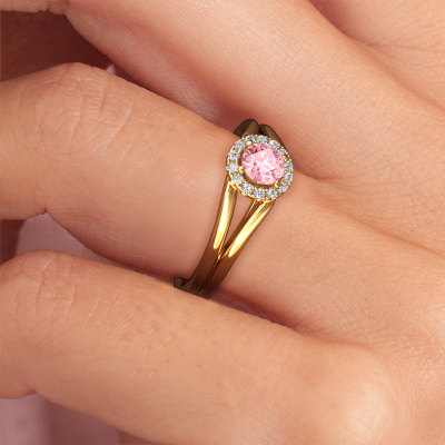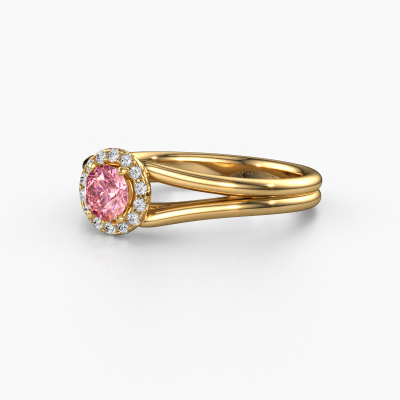 The ring shown above is called the Verla rnd 1. We call this type of ring a halo ring because it has one centre gemstone and a band that is also pave set with gemstones. The 14 Carat gold engagement ring is set with a round 4.7 mm pink lab grown diamond centre stone and the band is pave set with diamonds. What makes this classic gold halo ring special are the smaller sized stones embracing the centre stone. This gorgeous engagement ring is called a halo ring because the smaller gemstones give the centre stone a halo of surrounding light. In order for the smaller stones to enhance the centre stone, they have to be placed so there is no interference of light. And that's when our expert goldsmiths come in. Each individual stone is carefully set in the ring by hand. During manufacturing, light fall is constantly monitored to make sure the special halo is still visible. In the end you get a unique engagement ring, with a pink lab grown diamond of your choosing at its centre. You can imagine the effect of a ring of such significance when you give it to her on her special day to shine. By using a combination of the latest modern techniques, combined with ancient crafting, we can make all our engagement rings in our own studio. Each jewel is made to order. This is advantageous because we can offer you a price you won't find anywhere else.Our team adds new designs to our online collection daily. Our designers and goldsmiths work together in creating the best design. We strive to offer a diverse collection of jewels. Perhaps you have a specific jewel design in mind. One you came across somewhere. Please contact us for a free consultation. We will make you an offer, based on a fair price/ quality ratio, that will baffle you.To make it easier for you, we offer a 30 day return policy. Check our terms and conditions.