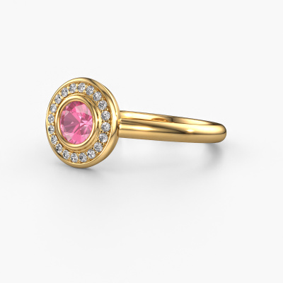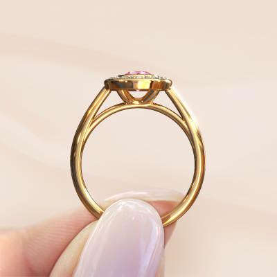 The ring shown above is called the Noud 1 RND. We call this type of ring a halo ring because it has one centre gemstone and a band that is also pave set with gemstones. The 14 Carat gold promise ring is set with a round 4.7 mm pink sapphire centre stone and the band is pave set with diamonds. What makes this traditional gold halo ring special are the smaller sized stones embracing the centre stone. This gorgeous promise ring is called a halo ring because the smaller gemstones give the centre stone a halo of surrounding light. In order for the smaller stones to enhance the centre stone, they have to be placed so there is no interference of light. And that's when our expert goldsmiths come in. Each individual stone is carefully set in the ring by hand. During manufacturing, light fall is constantly monitored to make sure the special halo is still visible. In the end you get a unique promise ring, with a pink sapphire of your choosing at its centre. You can imagine the effect of a ring of such significance when you give it to her on her special day to shine. By using a combination of the latest modern techniques, combined with ancient crafting, we can make all our promise ring in our own studio. Each jewel is made to order. This is advantageous because we can offer you a price you won't find anywhere else.Do you have a specific ring in mind? One you came across somewhere. Please feel free to tell us your wishes and we will turn your design into a unique promise ring. You can follow the development of your ring design because we use 3D drawings. This gives you a realistic preview of your design. We will gladly send you a non-binding offer, based on a fair price/ quality ratio. It will amaze you.To make it easier for you, we offer a 30 day return policy. Check our terms and conditions.